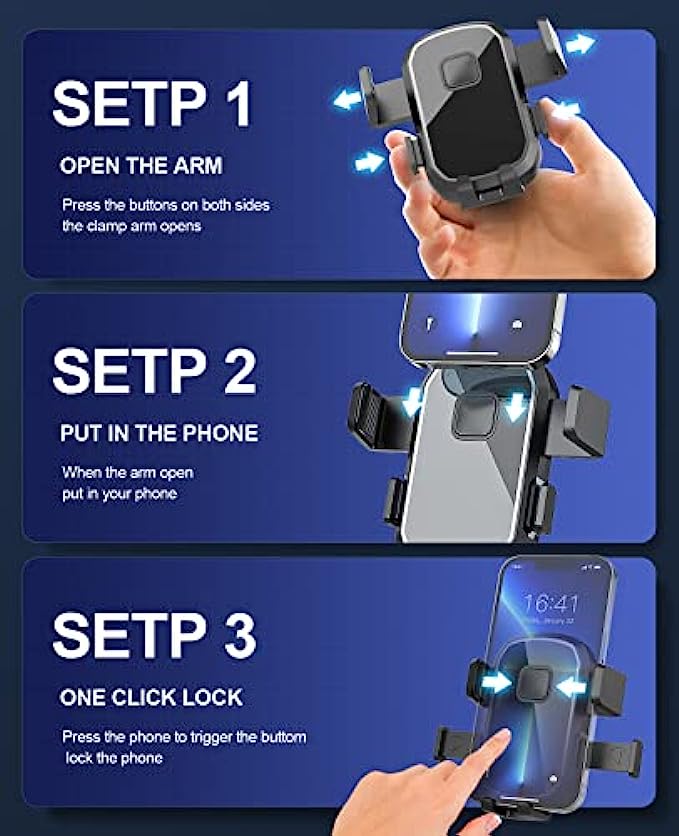 • 【ONE-HAND OPERATION】 Adjust the bottom foot of the iphone holder for car dashboard mount as per the size of your phone, and put your phone in it and lock your phone perfectly by adjusting the clamping arm. Press the buttons on both sides to release your smartphone in one second. Smartphone car mount gives you an easy and safe driving journey.