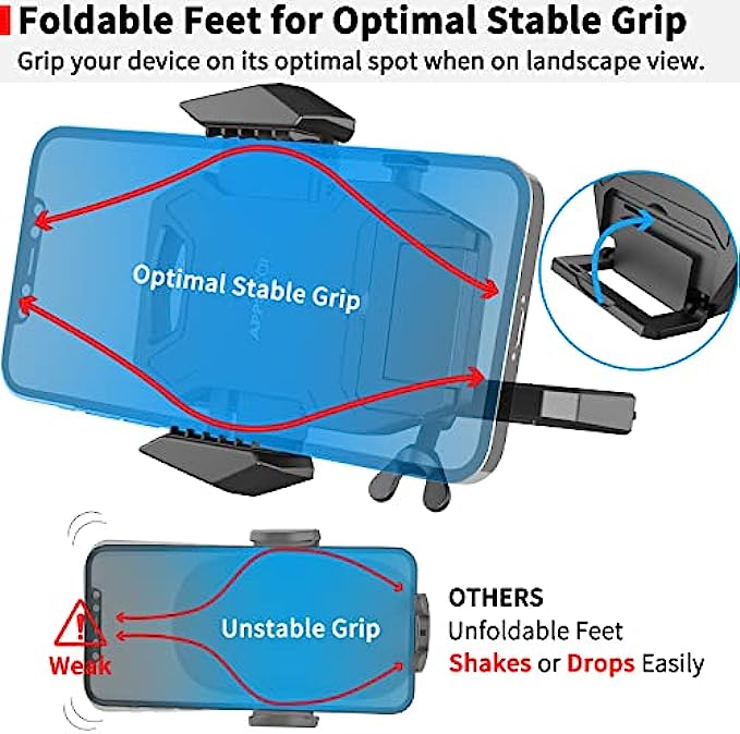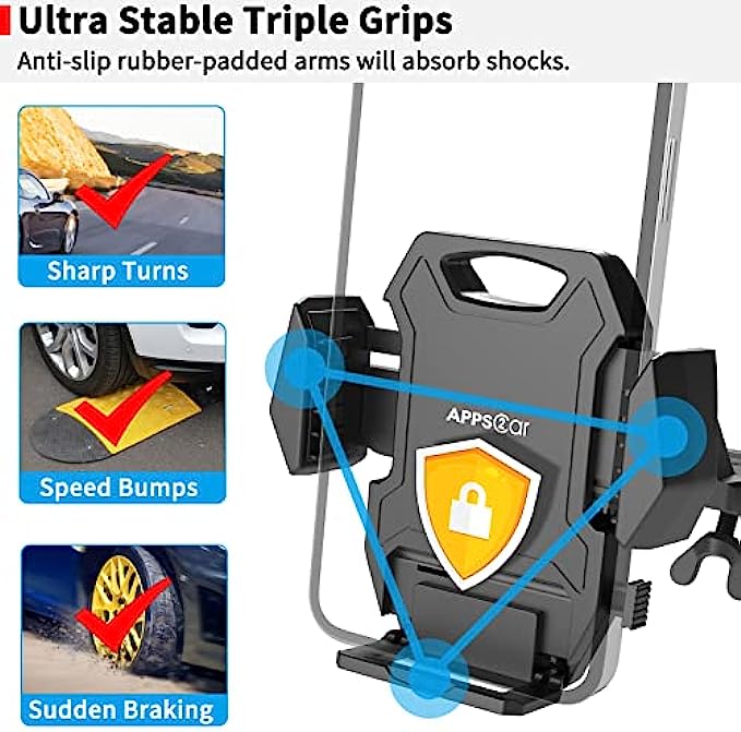 • 【Advanced Protection & Sturdy Mount】With 3 sides grip: collapsible bottom and two adjustable arms with silicon pad, it holds cell phone tightly. Screw-Locked base design, much securer than the air vent mount, suction cup dashboard windshiled mount. No interference with playing CDs.